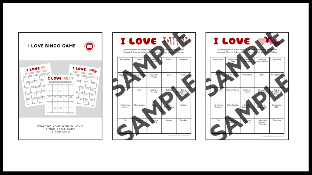 The I LOVE bingo game will help your women uncover what things the women in attendance at your event love.
